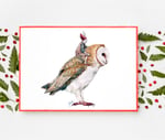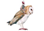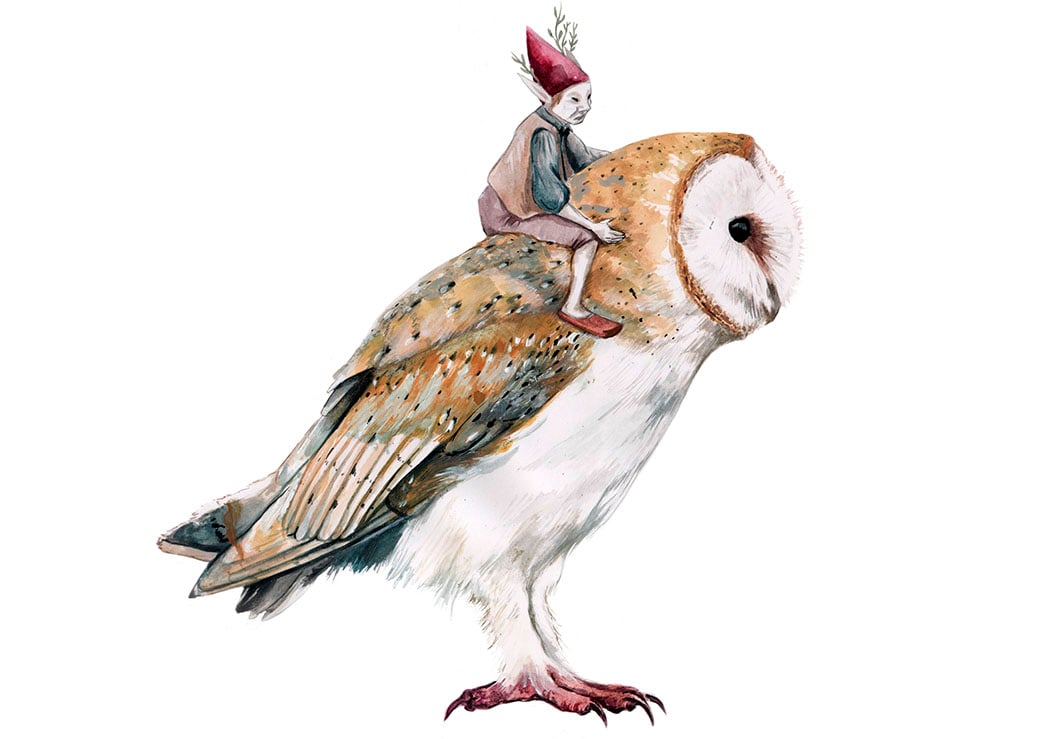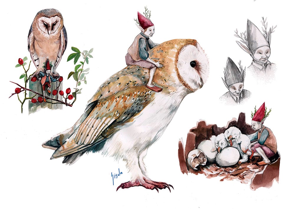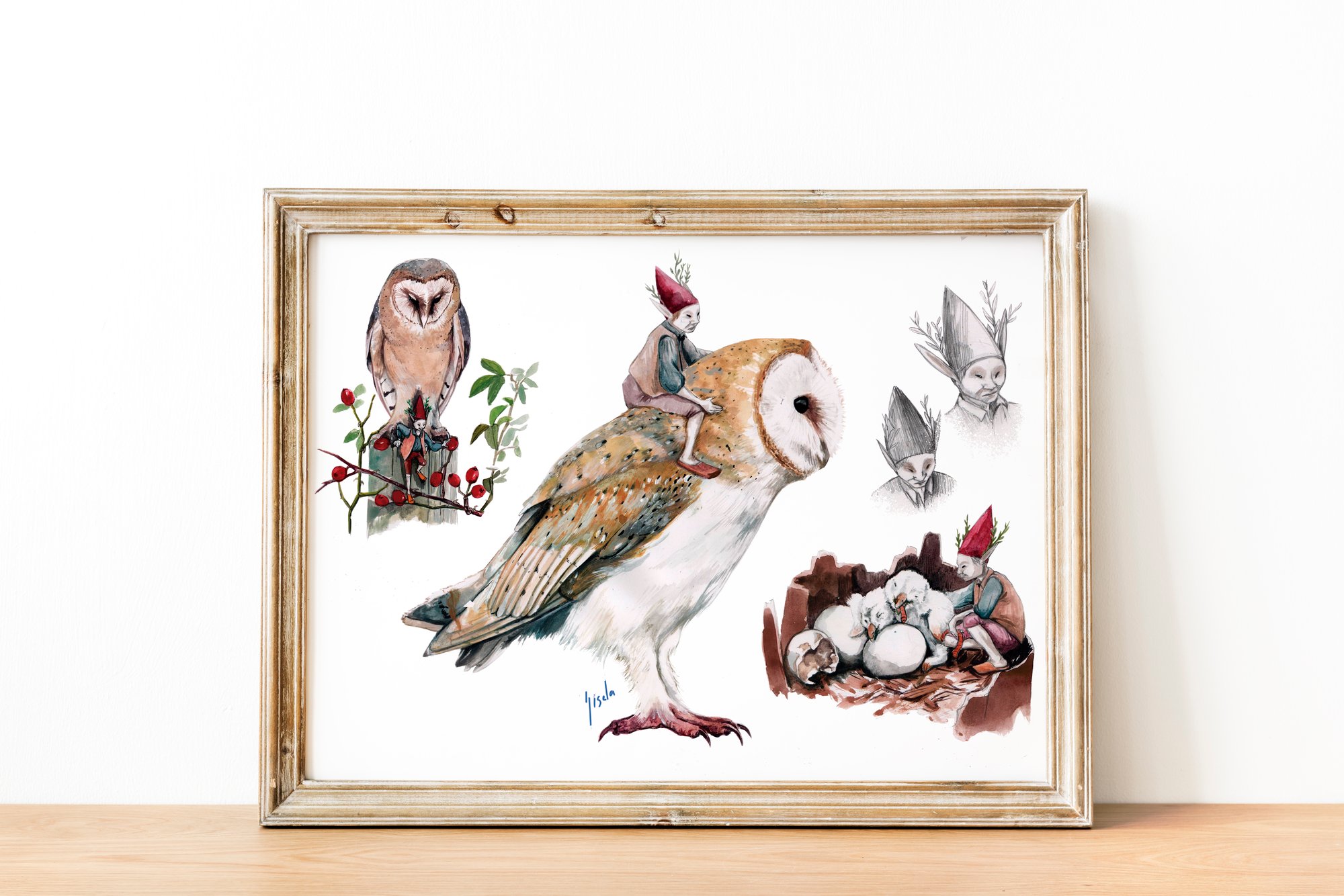 Barn owl with elf. Illustration made with gouache. Printed on 200gr. matte paper. . Size din-a3 (297mm x 420mm) Din-a4 (210x297mm) No frame included