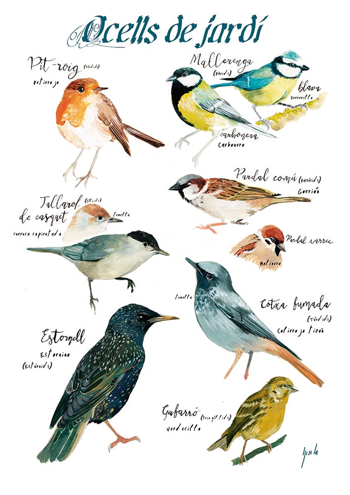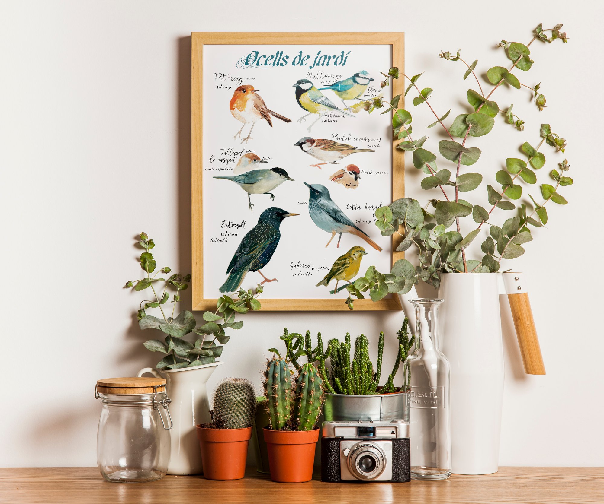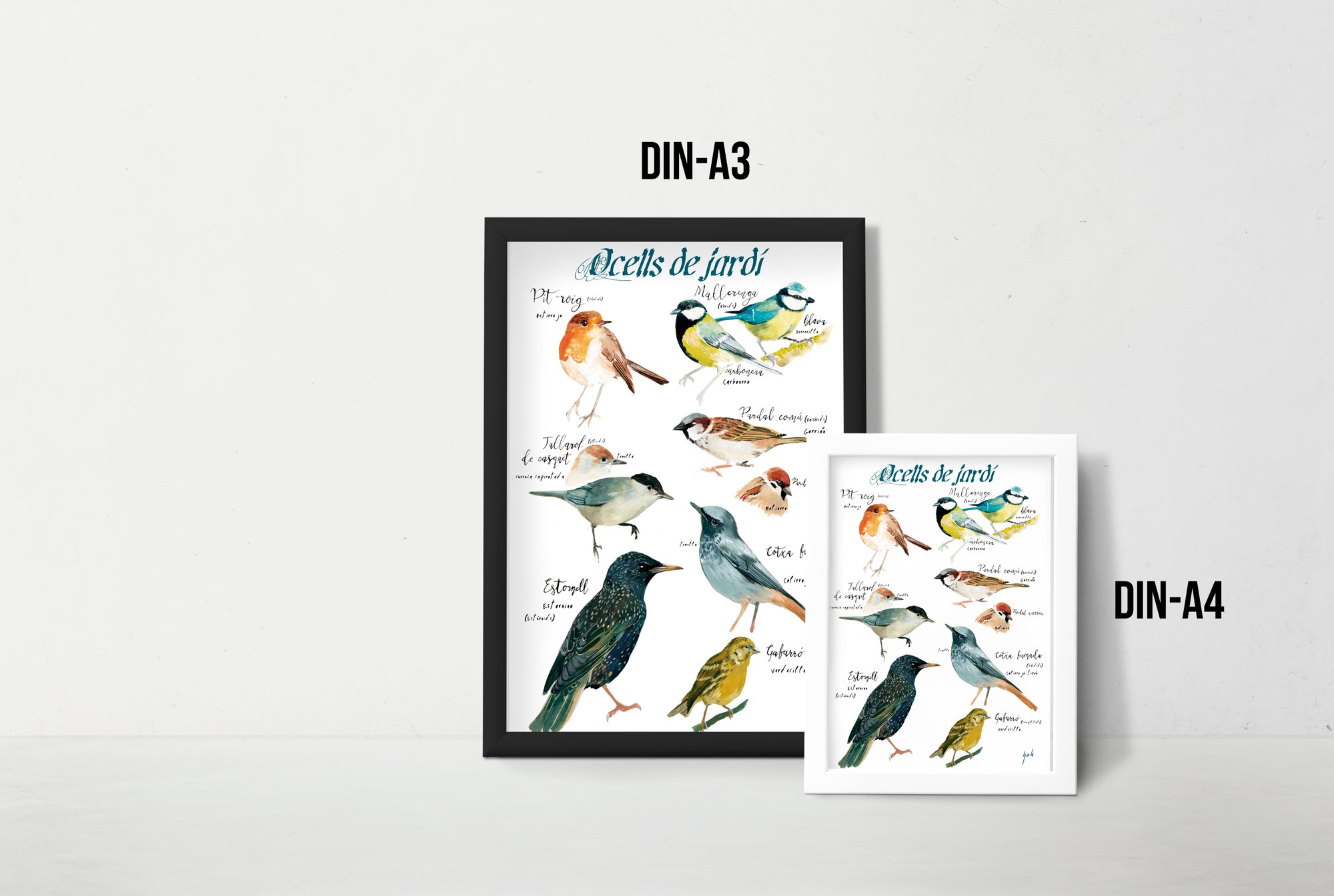 Ocells de jardí. Il·lustració feta amb gouache. Impresa en paper mat 200gr. Grandària din-*a3 (297mm x 420mm) Din-*a4 (210x297mm) Sense marc inclòs