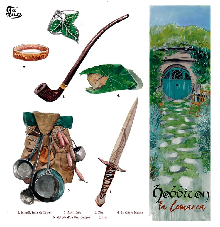 Set of things of the world of Tolkien. Illustration made with gouache. Printed on 200gr. matte paper. Text in catalan. Size (277mm x 297mm) No frame included