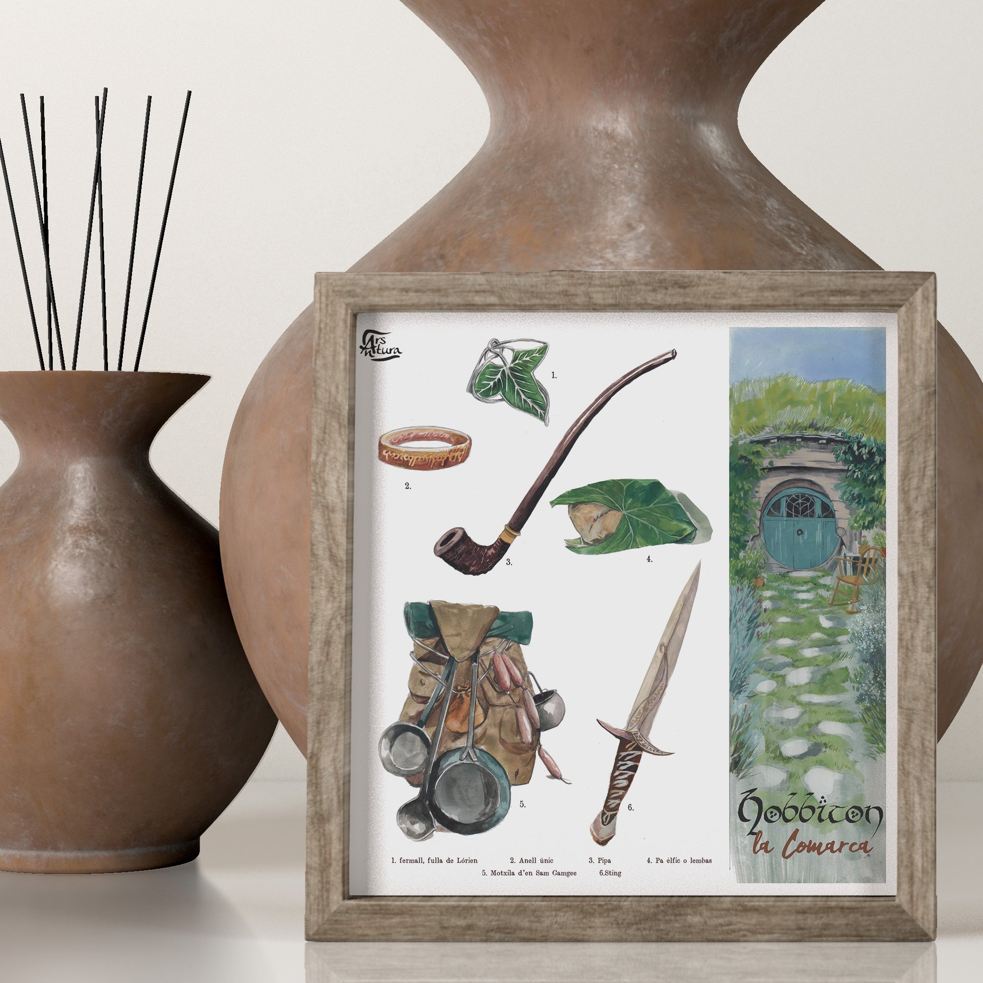 Conjunt d'elements del món de Tolkien. Il·lustració feta amb gouache. Impresa en paper mat 200gr. Text en català. Grandària (277mm x 297mm) Sense marc inclòs