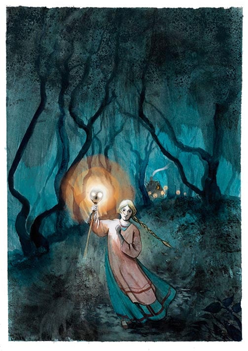 "Bava Yaga va empènyer a la jove fora de la casa, però abans de tancar la porta gran va agafar de la portella una de les calaveres d'ulls encesos, la va clavar en l'extrem d'un pal i li ho va donar a Vasilissa dient: